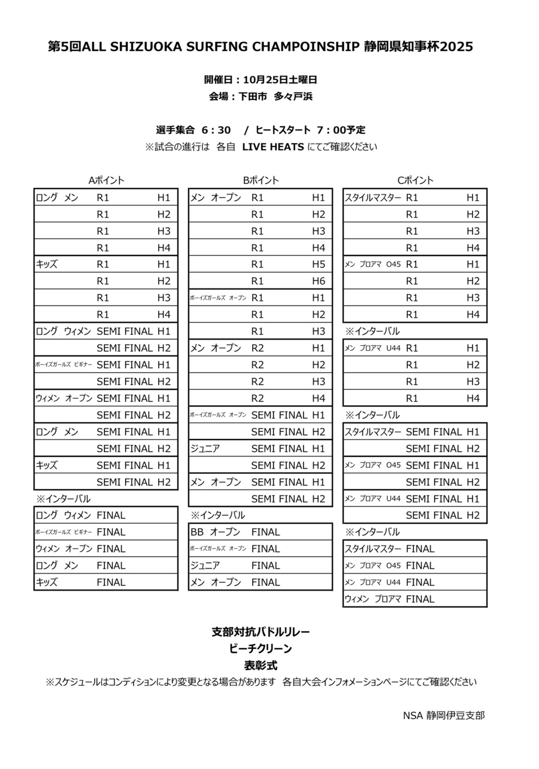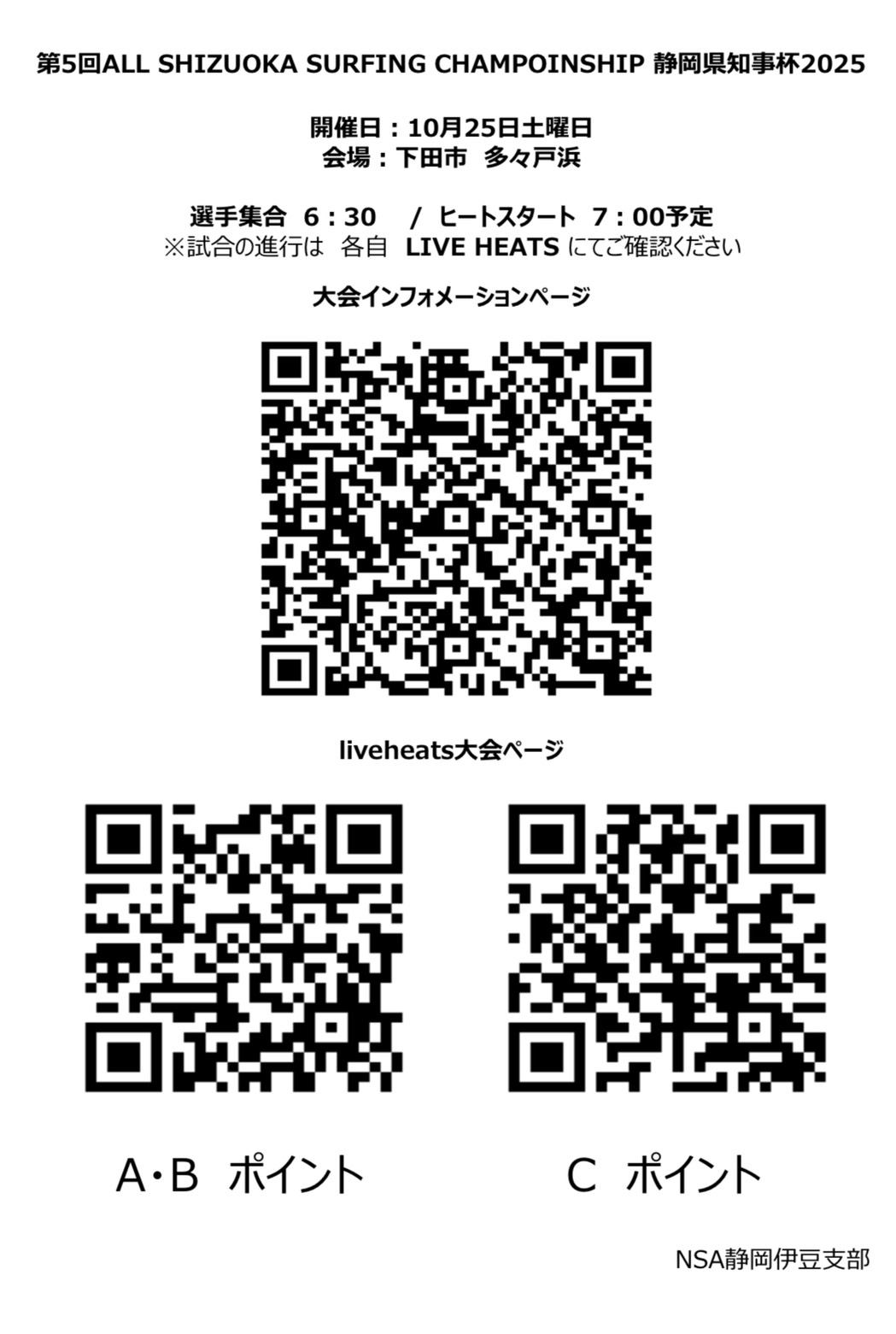 開催地やスケジュール等は、2025年10月24日(金曜日)に NSA静岡伊豆支部のホームページの大会インフォメーション、Instagram、Facebookにて発表いたします。
